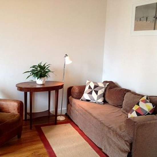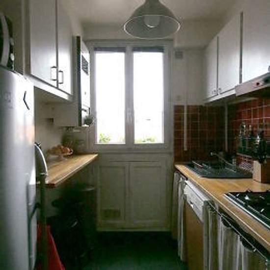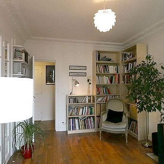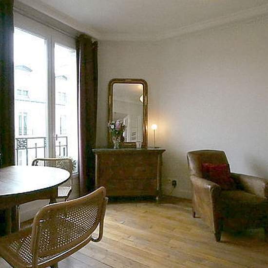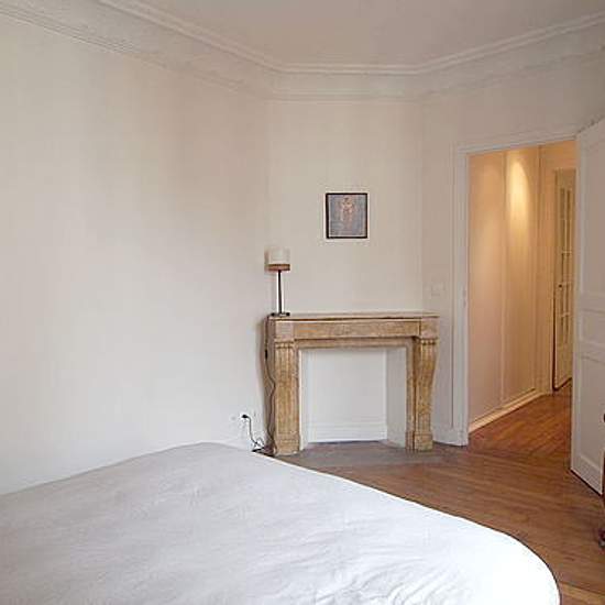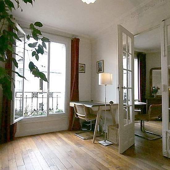 Landlord's comment: "The apartment is light-filled (facing the South, East and West), with windows on both sides of the apartment and views over the roofs of Paris from the fifth floor (with elevator). It has a large living space with a living room and dining room/office separated by French doors. The living room has a sofa that converts into a double bed. The bedroom, which faces the quiet courtyard, is separated from the living rooms by a hallway with a large closet. The rooms have lovely original moldings and wooden parquet. The kitchen i...
