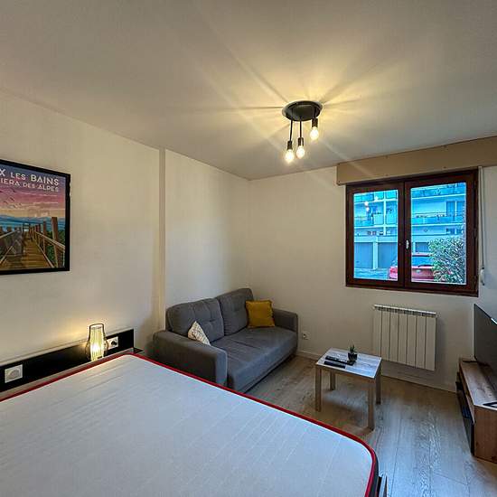Situé dans un quartier calme d'Aix-les-Bains, à seulement quelques minutes à pied de l'hyper centre et de ses commerces, ce bel appartement T1 de 25 m² offre un cadre de vie agréable et pratique. Installé au rez-de-chaussée d'une copropriété bien entretenue des années 80, il a été entièrement rénové avec goût et propose tout le confort moderne. L'appartement se compose d'une entrée, d'une salle d'eau avec WC, et d'une grande pièce de vie lumineuse comprenant une cuisine ouverte aménagée, un espace salon et un coin nuit astucieusement intégré...