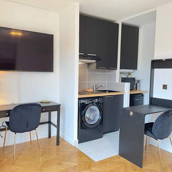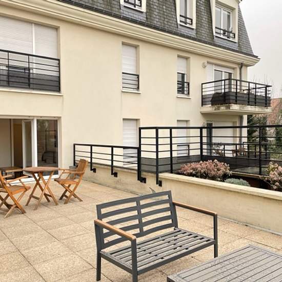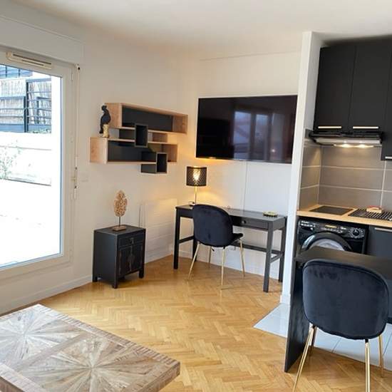 STUDIO entièrement meublé avec équipements intégralement neufs, prestations haut de gamme, et avec grande Terrasse (35 m2), proche Centre Ville d'Antony à 10mn à pied du RER B 'Fontaine Michalon' & 15mn du RER B 'Antony', au calme côté jardin, dans Résidence de standing (2008), au RDC - Entrée, Coin Cuisine équipé avec placards, plaques de cuisson, hotte, four combiné, réfrigérateur & lave-linge séchant, Pièce à Vivre avec placard, canapé convertible, bureau, table basse, TV, donnant sur grande Terrasse exposée Ouest avec salon de jardin, Sa...