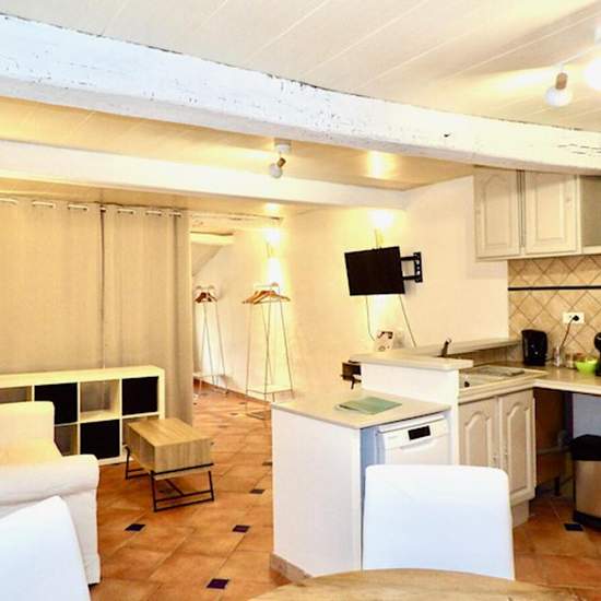 Notre agence SERENIS vous propose à la location ce magnifique appartement meublé de 40,60 m² avec vue ayant son coin nuit séparé au coeur du village de Bargemon, proche des commodités. Il se compose ainsi : - Séjour avec cuisine ouverte : avec canapé, table, TV, tout le nécessaire coté cuisine, plaques de cuisson, réfrigérateur, micro-ondes, cafetière, bouilloire, grille-pain, vaisselle et ustensiles. -Coté chambre : séparé du séjour par un long rideau, lit double, table de nuit, portants pour les vêtements. - Salle d'eau : douche et lavabo....
