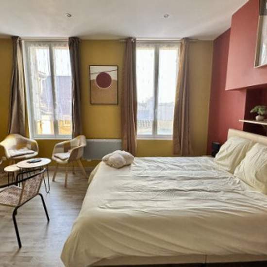 Studio entièrement équipé avec kitchenette, salle d'eau, grand lit double king-size. Vu sur la cour arrière. avec deux fenêtres composés de rideaux. Se situe au premier étage d'un immeuble ancien sans ascenseur.