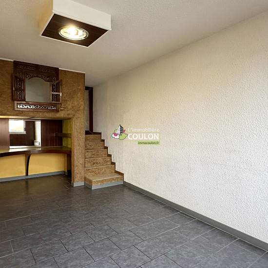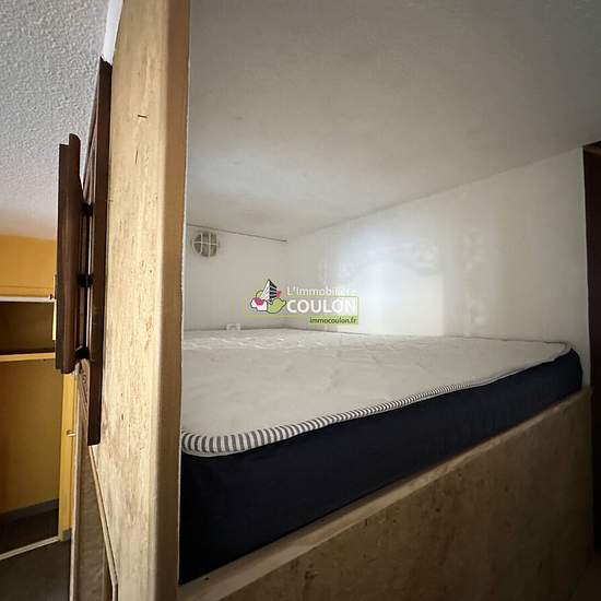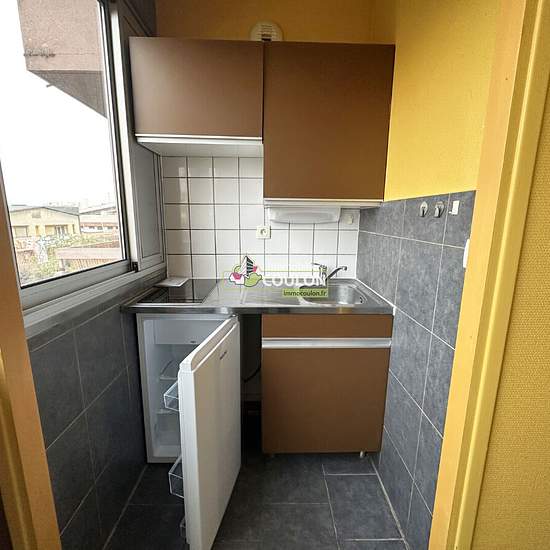 Du caractère et une optimisation de l'espace pour ce T1 tout en carrelage gris : kitchenette équipée, agréable pièce à vivre corportant un lit en mezzanine avec son espace bureau en dessous, salle de bains-wc, cave et parking, 375€HC.