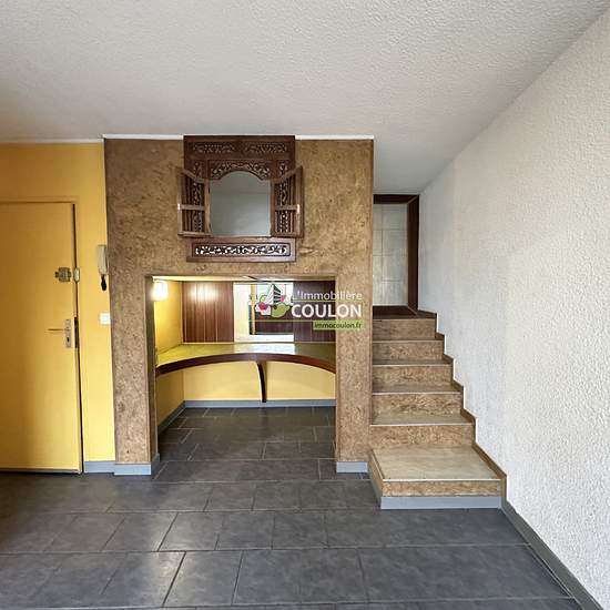 Du caractère et une optimisation de l'espace pour ce T1 tout en carrelage gris : kitchenette équipée, agréable pièce à vivre corportant un lit en mezzanine avec son espace bureau en dessous, salle de bains-wc, cave et parking, 375?HC.