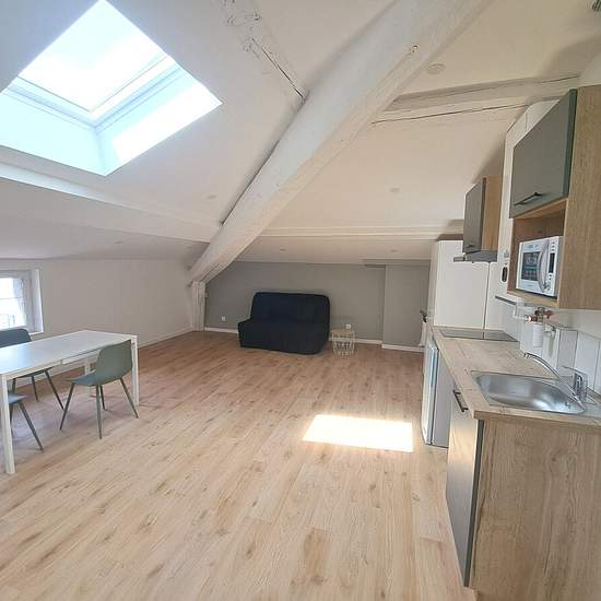 A proximité immédiate du tram et tous commerces en plein centre ville (rue de la Michodière), grand studio mansardé (surface au sol 32 m²) neuf et entièrement meublé, composé d'une cuisine aménagée et équipée (plaques induction, hotte, micro-ondes, frigo, vaisselle, emplacement pour lave-linge), d'une pièce de vie avec lit BZ de qualité, table extensible et armoire, d'une salle d'eau avec WC. Belle luminosité. Honoraires de 258 € TTC à la charge du locataire comprenant 70 € TTC pour l'état des lieux. Loyer de base 465.00 €/mois. Provision su...