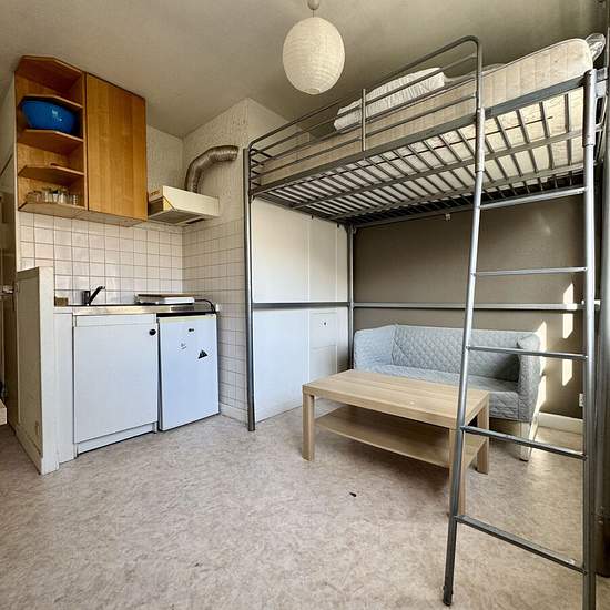 G87 - À deux pas des facultés et des transports en commun, en face du Crous, 46 rue Etienne Dolet à Clermont-Ferrand, un studio meublé et entièrement équipé de 16,27 m² situé au 2ème étage sans ascenseur d'une résidence sécurisée. Il se compose d'une entrée avec un placard de rangement, d'une pièce principale (lit en mezzanine, canapé, table et chaises) avec un coin kitchenette (plaque de cuisson, réfrigérateur, micro-onde, placards, vaisselle) et une salle de bain avec un wc. Le chauffage est collectif et les radiateurs sont équipés de répa...