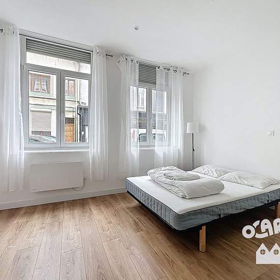 [ À LOUER ] à Dunkerque centre - Une chambre de 16,74 m² et sa salle d'eau privative dans une maison de colocation de 175 m² entièrement rénovée. Loyer mensuel charges comprises : 650 euros - Dans la chambre privative : - La pièce de nuit équipée d'un sommier a latte 140 x 200 , un matelas 14 x 200 , protège matelas, commode 3 tiroirs, table basse, d'une lampe de chevet, d'une lampe sur pied, 2 oreillers , 1 couette 220 x 240. - Une salle d'eau privative et équipe?e d'une douche, un meuble vasque avec 2 tiroirs de rangement , d'un miroir, d'...