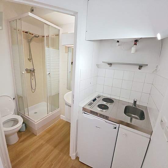 STUDIO 14 m2 comprenant une pièce principale avec sa kitchenette (frigo et plaques), une salle d'eau avec wc. Une porte fenêtre donnant sur résidence. Chauffage individuel électrique. Une place de parking en extérieur dans la résidence. Idéal pour étudiant(e). Disponible de suite.