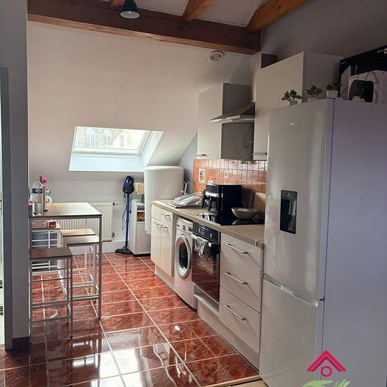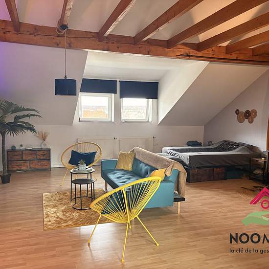 A Forbach, à proximité immédiate du centre ville, cet appartement mansardé type loft de 45 m² au 2e étage, avec beaucoup de charmes, vous séduira par : 1 cuisine équipée avec plaque de cuisson vitrocéramique, four et hotte ouverte sur la splendide et vaste pièce principale, 1 salle d'eau avec wc. Chauffage gaz collectif compris dans les provisions pour charges. Chaque appartement possède son compteur calorifique. Vous bénéficiez également d'1 cave commune en sous-sol. Les provisions pour charges mensuelles de 120 € comprennent : le chauffage...