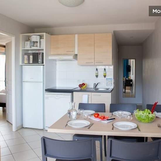 Set between land and sea, our hotel-residence is just a stone's throw from Fréjus town centre and its Roman arena. Whatever the season, the residence is an ideal base for nature lovers (close to the Estérel massif), water sports enthusiasts (beach 5 km away) and golfers (Valescure golf course 6 km away). With its attractive exterior, the establishment welcomes you in a green Mediterranean setting, offering its guests peace and serenity. Comprising a large living room with sofa-bed (2*80*190) and fitted kitchen, a bedroom with double bed (140...