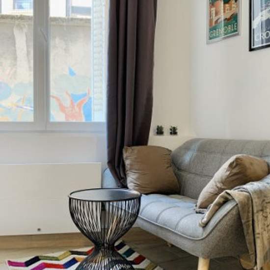Découvrez notre joli petit studio situé rue Nicolas Chorrier à Grenoble. --------------------------------------------------------------------------------------------------------------------------- Votre logement : Situé en rez-de-chaussée d'un petit immeuble de 2 étages, cet astucieux studio se compose : - d'une pièce de vie avec kitchenette, canapé et table; - d'une mezzanine (hauteur : 1m60) avec lit double; - d'une salle d'eau avec grande douche et WC. L'appartement dispose d'un espace de couchage : - un lit double en 140cm sur la mezzani...