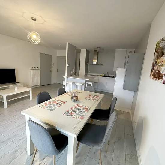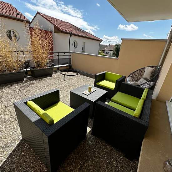 EN No agency fee! We offer a splendid fully-furnished one-bedroom apartment, located on the ground floor of residence, built in 2004. Offering a total living area of 54 m², the apartment is composed of open kitchen/living room, bedroom, bathroom, separate toilet and a 23 m² terrace. Outdoor parking space is available for the apartment. The closest train station is Hettange-Grande Gare, accessible in 5 minutes on foot. Direct buses to Kirchberg / Luxembourg . Easy access to A3. There is an Internet connection. FR pas de frais d'agence Nous...