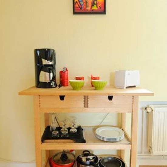 30 M² Studio, located on the 2nd floor without elevator, accommodating 2 people including:-a living with a corner kitchen equipped with: • a table and 4 chairs • a microwave • 2 cooking plates • refrigerator • hood • coffee maker • toaster • all necessary for cooking (crockery, cutlery, glassware, kitchen utensils, etc.) -the corner room with: • a bed 140x200cm • folding bed • a convenient • bathroom with shower, washbasin and WC • TV • WIFI • free washing-machine and iron • all the household linen is provided (for rentals of a week and more...