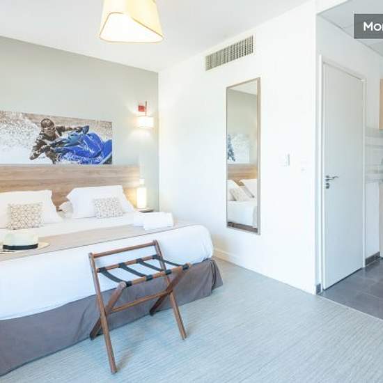 On the banks of the Siagne, the residence is just 1.4 km from the beach, which is a 10-minute walk away, and 15 minutes from Cannes city centre. It is 7 km from the Palais des Festivals in Cannes and 2 km from the Centre Expo Congrès in Mandelieu. The setting of Presqu'île de Robinson will make your stay a peaceful break on the Côte d'Azur in fully-equipped flats. The outdoor swimming pool is open in season (from June). The studio is equipped with a double bed and all the comforts you need for your stay. Pets are welcome at an additional cos...