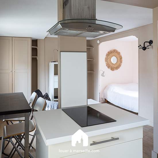 Studio au 4ème et dernier étage sans ascenseur d'un immeuble bien entretenu. Il se compose d'une cuisine ouverte entièrement équipée (machine à laver, micro onde, frigo taille moyenne, plaques sur ilot central, etc..) d'un coin salon/séjour ouvert sur une chambre avec lit double et TV et d'une salle d'eau fermée avec cabine de double, vasque et radiateur électrique. Nombreux rangements - chauffage électrique - Fibre internet installée - Double vitrage - Sonnette. Accès à une terrasse à jouissance partagée.