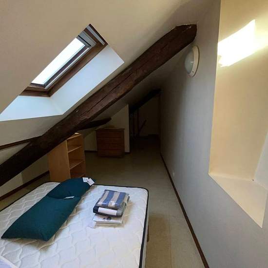 Libre. Studio meublé de type duplex en centre ville situé au dernier étage (deuxième et troisième étage). Il comprend un coin cuisine ouvert sur la pièce de vie, une salle d'eau / wc et une chambre (mansardée) à l'étage. Huisseries bois double vitrage et chauffage électrique individuel. (Plus d'infos : / EMAIL