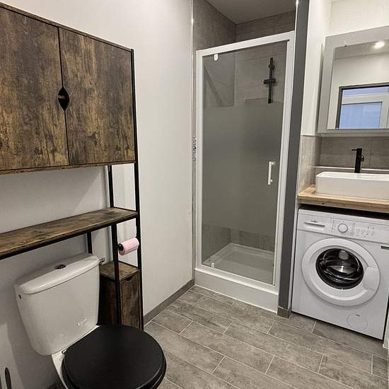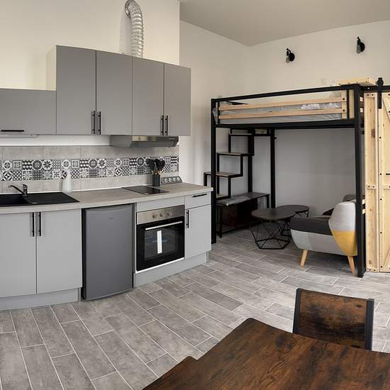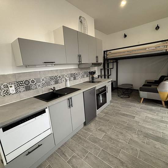 Studio meublé NEUF comprenant : entrée, salle d'eau aménagée (machine à laver)/WC, pièce à vivre avec cuisine aménagée et équipée (four, plaque de cuisson, lave-vaisselle, réfrigérateur)/coin salon et chambre (rangements) Chauffage par pompe à chaleur (climatisation). Cave commune. Disponible. Superficie habitable : 28,94 m² SITUE AU CENTRE VILLE - PROCHE DE TOUTES COMMODITES - PROCHE PARKING -