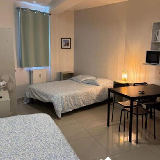 Charmant studio étudiant au 2ᵉ et dernier étage d'une résidence récente, calme et sécurisée, avec laverie à chaque étage. Appartement entièrement équipé : kitchenette (frigo, plaques, évier, hotte, micro-ondes, rangements), salle d'eau moderne (douche à l'italienne, meuble vasque, miroir, WC suspendu). Séjour lumineux avec canapé convertible, espace bureau, table basse, nombreux rangements et coin-repas (table et 4 chaises). TV TNT & Netflix inclus, Wi-Fi, linge de maison et ustensiles fournis. Proche commerces et transports. Updated on 06/1...