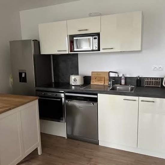 Location T2 meublé 43m² avec balcon 10m² – Quartier Éraudière à Nantes À louer, appartement T2 entièrement meublé, de 43 m², situé dans le quartier calme et recherché de l'Éraudière à Nantes. Résidence récente datant de 2020, avec de belles prestations. L’appartement comprend : - Un séjour lumineux - Une chambre séparée - Une cuisine aménagée et équipée - Une salle de bain avec WC - Un balcon de 10 m² Mobilier et équipements complets : lit, canapé, télé, tables basses, îlot de cuisine, chaises, rangements, lave vaisselle, lave lin...