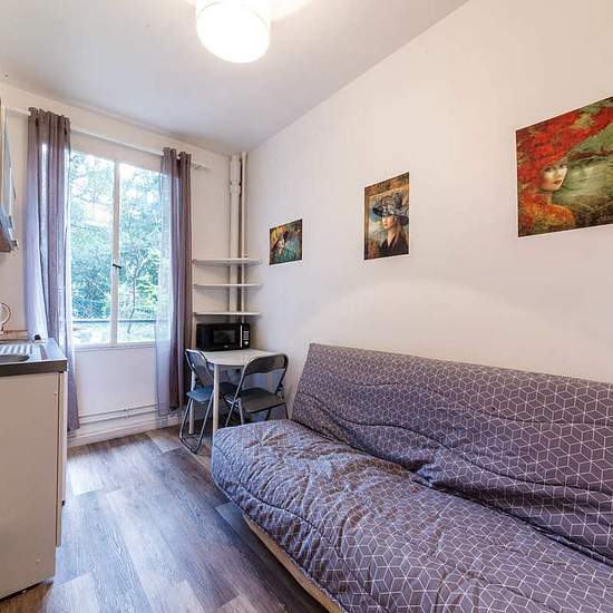 Small studio for two persons for rent (available as for short as long-term stays) in a nearest suburb of Paris - Neuilly-sur-Seine. Surface - 10 square meters; ground floor of a residential building with a patio (barbecue area). The flat has a sofa, a table, chairs, shelves, a wardrobe; a kitchen space. The studio is located in a convenient suburb of Paris, located on the western border of the city near Porte Maillot and Arc de Triomphe, the business district of La Defense. Metro: Les Sablons