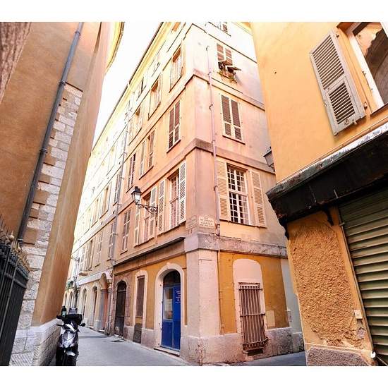 Au cœur du Vieux Nice, à quelques mètres de la Cathédrale Sainte Réparate, proche mer, tram et toutes commodités, vaste F1 meublé, beaux volumes, grande cuisine équipée et rangements.