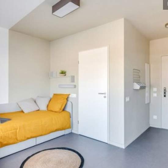 T1 entièrement meublé avec un lit simple de 90x200cm et ses tiroirs de rangement, un chevet mobile ou intégré à la tête de lit, un bureau avec caisson et fauteuil, une commode ou une grande penderie, une table de repas avec une chaise et de nombreux autres rangements. L'appartement est équipé d'une applique murale en tête de lit, d'une lampe de bureau, d'une TV sur support mural et d'un kit de lit (oreiller, couette, alèse). La kitchenette est entièrement équipée en vaisselle, ustensiles et appareils électroménagers y compris une bouilloire ...