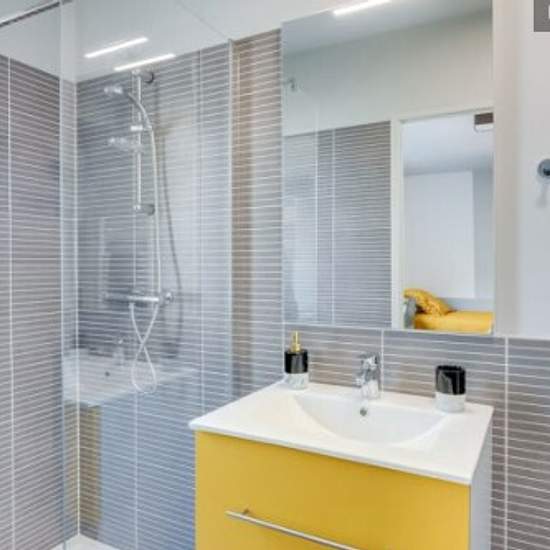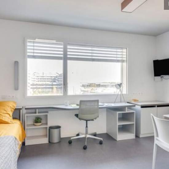 T1 entièrement meublé avec un lit simple de 90x200cm et ses tiroirs de rangement, un chevet mobile ou intégré à la tête de lit, un bureau avec caisson et fauteuil, une commode ou une grande penderie, une table de repas avec une chaise et de nombreux autres rangements. L'appartement est équipé d'une applique murale en tête de lit, d'une lampe de bureau, d'une TV sur support mural et d'un kit de lit (oreiller, couette, alèse). La kitchenette est entièrement équipée en vaisselle, ustensiles et appareils électroménagers y compris une bouilloire ...