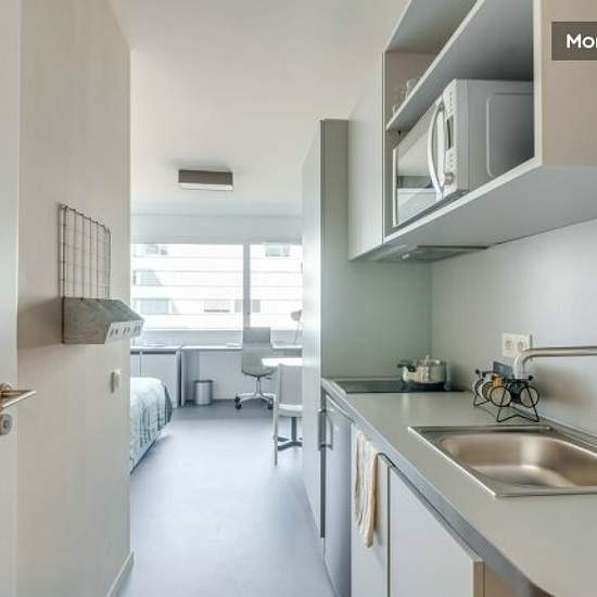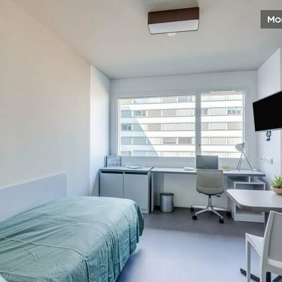 This accommodation is only available for rent for students. T1 fully furnished with a single 90x200cm bed with storage drawers, a bedside cabinet or integrated into the headboard, a desk with pedestal and armchair, a chest of drawers or large wardrobe, a dining table with chair and plenty of other storage space. The flat is equipped with a wall light at the head of the bed, a desk lamp, a wall-mounted TV and a bed kit (pillow, duvet, draw sheet). The kitchenette is fully equipped with crockery, cutlery and appliances, including a kettle and...