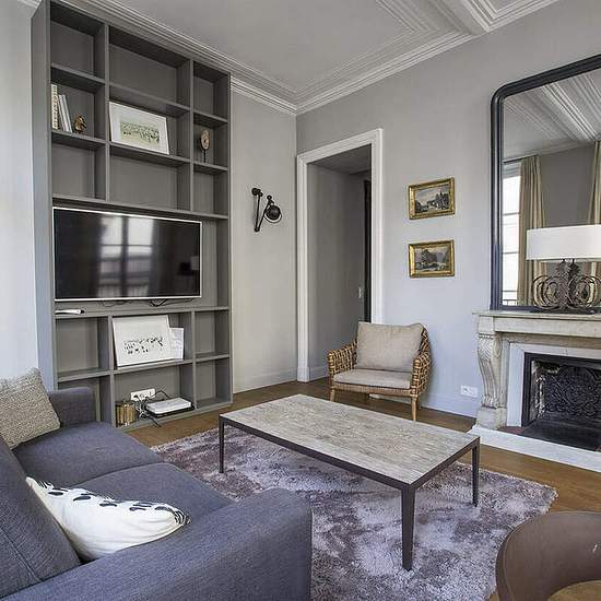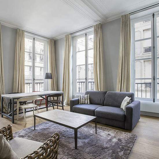 1-bedroom furnished apartment for rent on Rue des Moulins in the 1st arrondissement of Paris. It's a cozy and attractive residence for a couple or a family with a child in the very center of the French capital. Original interior; excellent furnishings; modern appliances; high windows. Layout: living/dining room with sofa, armchair, dining table, shelves, fireplace, coffee table, mirror; bedroom with a comfortable bed, armchair, pouf, bedside table, storage space; fully equipped kitchen; bathroom with shower; toilet; hallway. This apartmen...