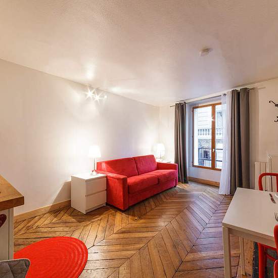 Planning a short stay in Paris? Choose a light furnished Paris studio apartment at Boulevard de Bonne Nouvelle in the 2nd district of the city. It's a small studio for a couple in a nice area of the French capital. Studio surface - 20 square meters; capacity - two tenants; 2nd French floor; no elevator; The living room has a sofa bed, a table, chairs, a chest of drawers, TV, lights. Open kitchen. Shower room combined with WC. The studio is located in a very good Paris neighborhood (Grands Boulevards), not far from the city center with its...