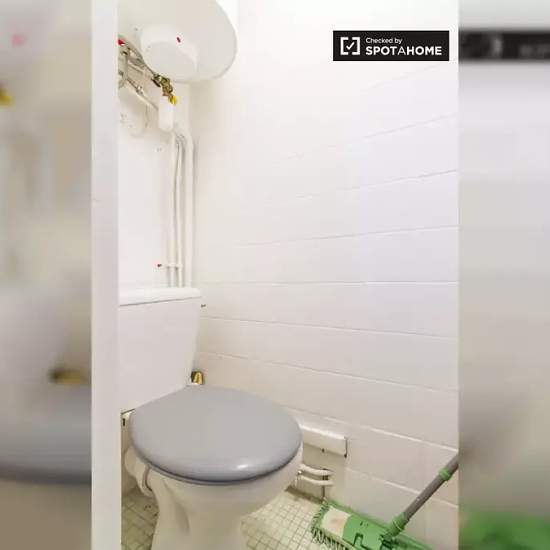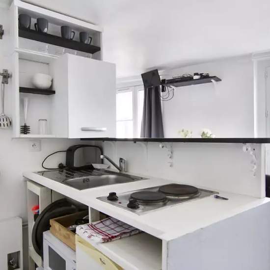 Located in the lively 4th arrondissement, this 20 m² studio is a stylish property with great 5th floor views of the neighborhood. The studio has wood flooring and simple but practical furniture. There is a pull-down double bed in the corner, a dining table for 2, and a breakfast with stools. For storage, you have a standalone and built-in wardrobe. The kitchen corner is fully equipped, including a dishwasher. On Rue des Ecouffes, you are right next to the popular Marais area, known for its charming medieval streets. The 4th arrondissement is...