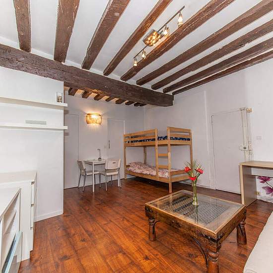 Planning a family vacation in Paris? A nice place for a stay will add a lot of impressions to your trip. We offer a light furnished studio in the centre of Paris at Rue de l'Arbalete in the 5th district of the capital. The studio can accommodate up to four people. Surface - 27 square meters; ground floor; wooden flooring; The living room is well furnished: sofa, bunk bed, coffee table, chest of drawers, desk, chairs, shelves. Small equipped kitchen. Bathroom. This Paris studio is located in an excellent quarter of the city near the Luxemb...