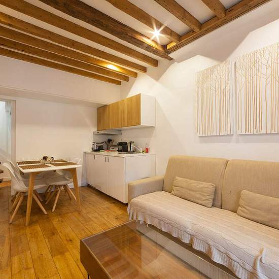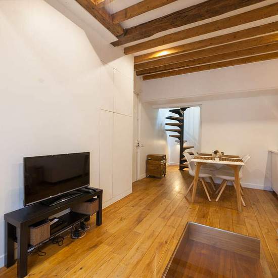 Furnished duplex apartment for rent at Rue Saint-André des Arts in the Latin Quarter of Paris (6th district). This is a rather small, but cozy flat for a family with a kid or two couples who plan to spend their vacation in the French capital. A truly great location in the old part of the city in the very heart of Paris, just a short walk from Notre Dame. Number of residents - up to 4 persons; surface - 37 square meters; 6th floor of a building; view over the rooftops of Paris. Layout of the apartment: the living room (a sofa bed, a decorat...
