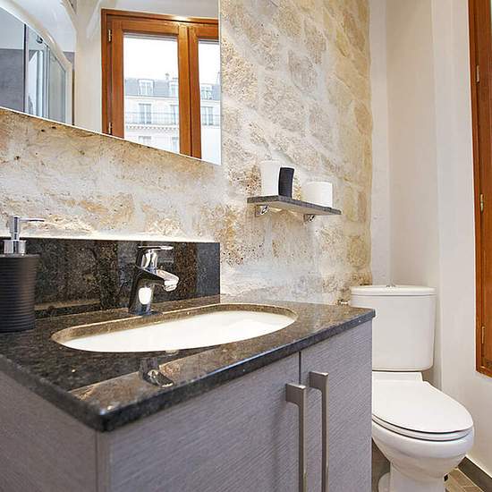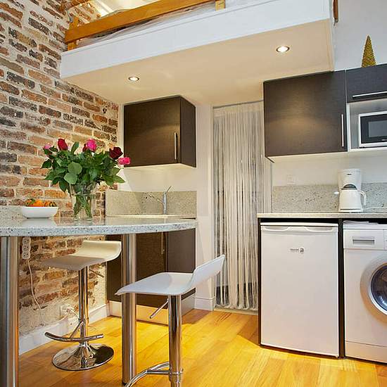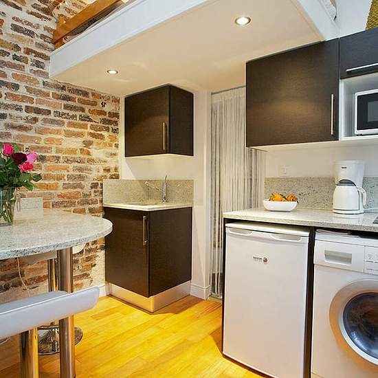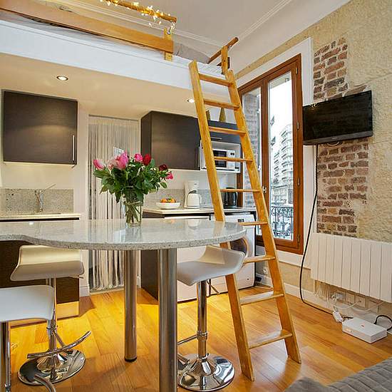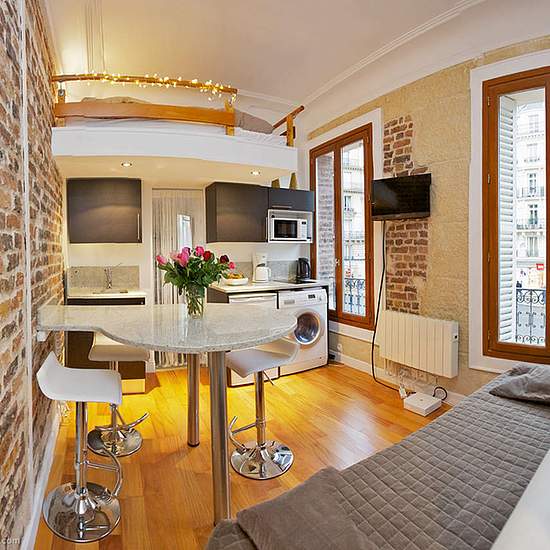 Furnished, tastefully decorated studio apartment with a mezzanine for rent in the 6th arrondissement of Paris at Rue de Rennes. The living room with large windows facing the street, TV, sofa, table, chairs, lamps; the open kitchen with an electric stove, microwave, refrigerator, coffee maker, kettle, washing machine, cupboards, kitchen utensils; bedroom with a double bed is on the mezzanine, the bathroom. Location near the Luxembourg Gardens. Metro: Line 4 — Saint-Placide