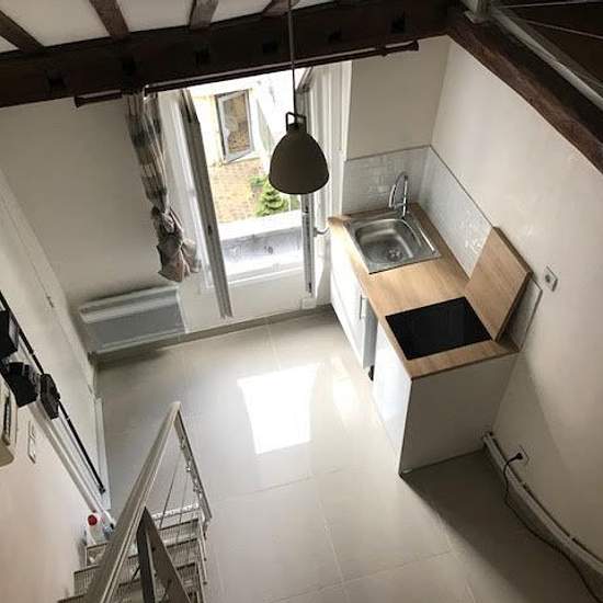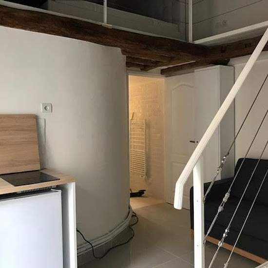 À proximité des folies bergères, rue saulnier. Au 3ème étage d'un immeuble ancien, charmant duplex meublé d'environ 25 m² au sol, 16,98 m² loi carrez comprenant un séjour avec une cuisine ouverte, une salle d'eau avec wc. À l'étage, une chambre avec un espace de rangements. Poutres apparentes, beaucoup de charme, quartier agréable. Libre de suite.