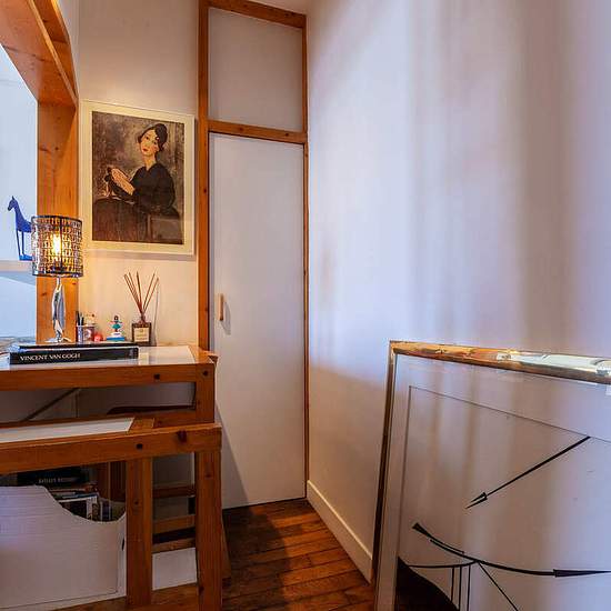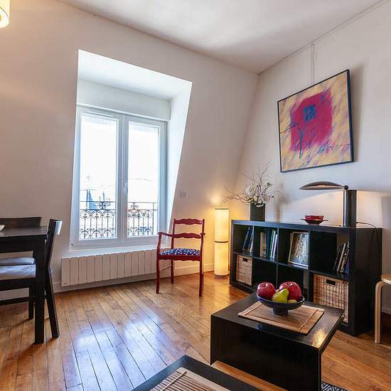 Comfortable well-furnished 1-bedroom apartment in Paris at Rue Sedaine in the 11th arrondissement of the city. It is a cozy & comfortable apartment for a family or a friendly company vacation in the most romantic city of the world. Capacity - four people, surface - 37 square meters, the 5th French floor of a residential building with a concierge and an elevator, natural wood flooring, nice interior, good furniture. Layout of the apartment: living room with a sofa, an original coffee table, shelves, paintings, a dining table and chairs; bed...
