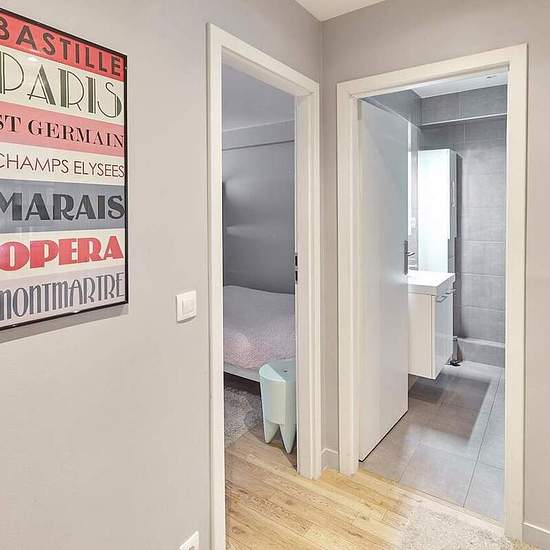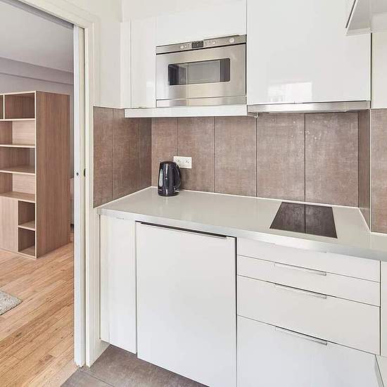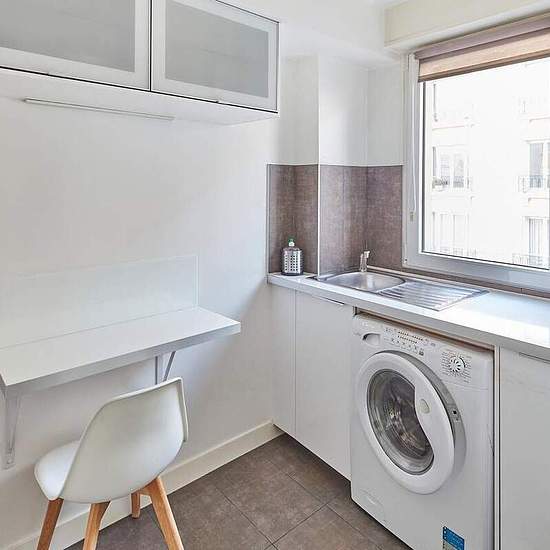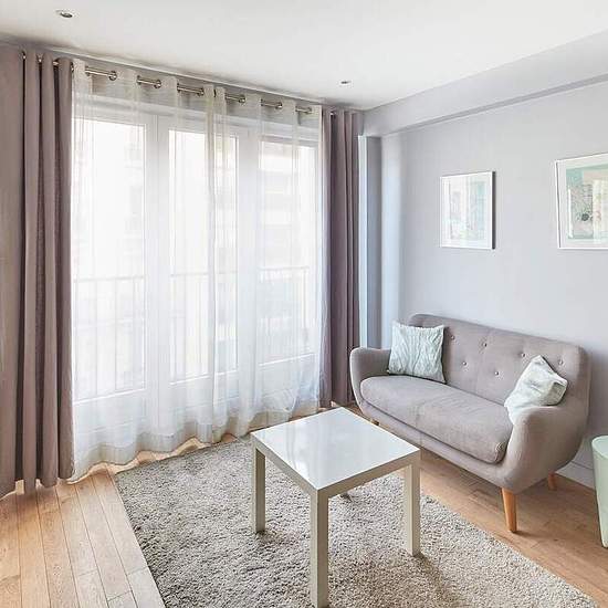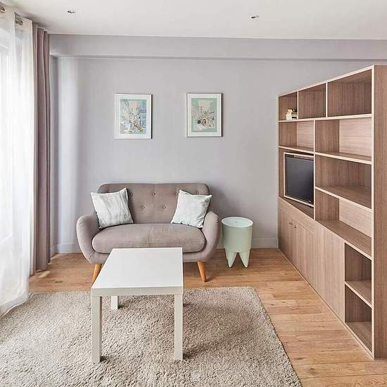 Very light, attractive, furnished studio apartment for rent on Rue du Théâtre in the 15th arrondissement of Paris. It's a comfortable flat for a couple in a convenient neighborhood of the French capital. Surface - 35 square meters; 3rd floor of a building with elevator. The living room is divided into two parts and has a sofa, a bookcase for clothes and decorative items, a double bed, a TV, and a coffee table. Equipped kitchen. Shower room combined with a toilet. Entrance hall with a spacious wardrobe for storing clothes and other items. ...