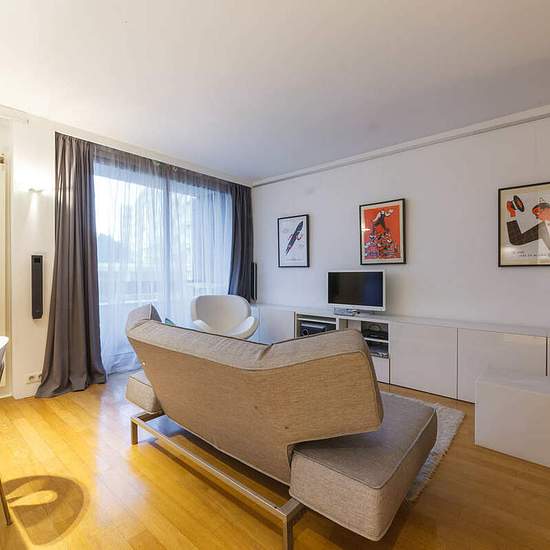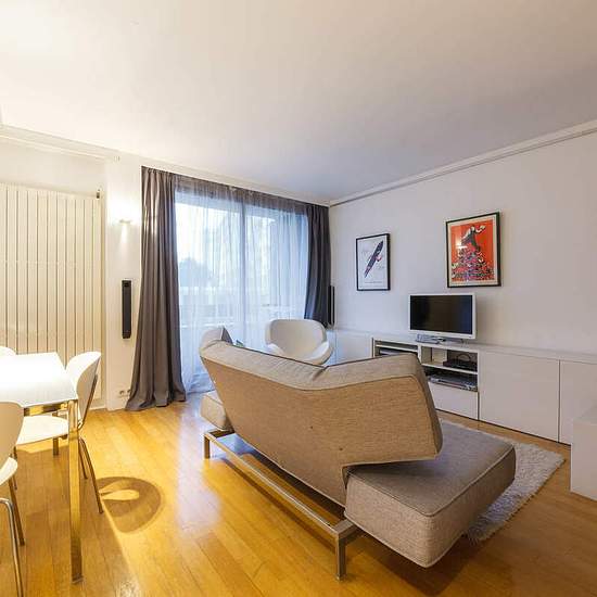 Bright, stylish, furnished 1-bedroom apartment for long-term rent in the 15th district of Paris on Rue de la Fédération. Comfortable flat for a couple or a family with a child in a good neighborhood just a few minutes walk from Champ de Mars. Surface - 42 square meters; excellent furnishing; quality home appliances; 2nd floor of a building with elevator; maximum number of residents - 4 persons. Minimum rental period - 2 months. Layout of the flat: a light living room with big windows (sofa bed, armchair, TV); an open fitted kitchen with d...