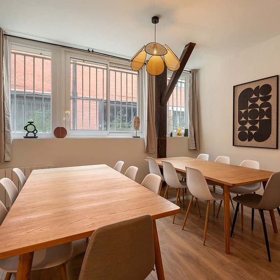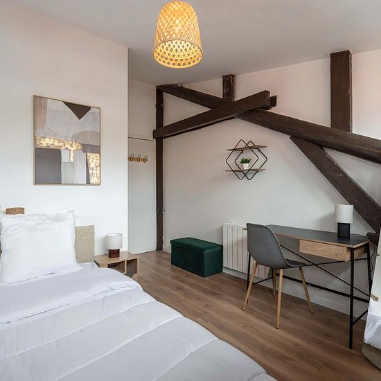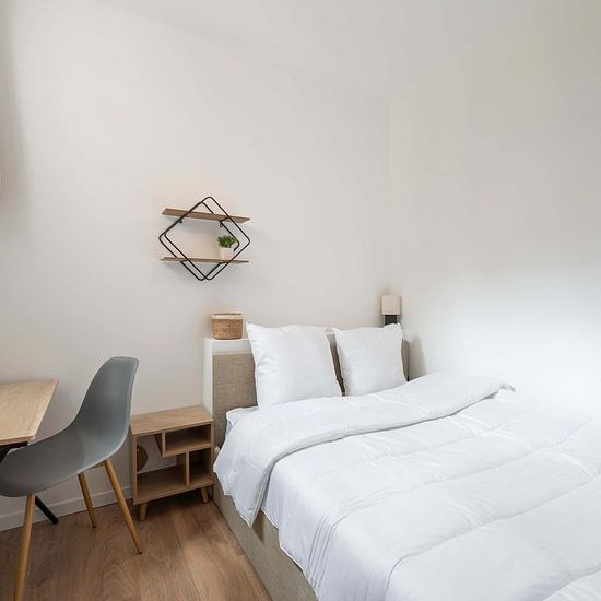 [EN] Your private bedroom is fully furnished with everything you need to comfortably rest, relax, and enjoy your time in Paris. In addition to an en-suite bathroom, you bedroom is also equipped with a cozy bed, a desk and a chair, making it easy and convenient for you to work or study from home. Please note: Bedsheets are not provided, allowing you to personalize your space the way you like it! This co-living apartment offers the best of both worlds: privacy and community. Alongside your private bedroom, you’ll be able to enjoy several share...