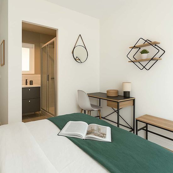 [EN] Your private bedroom is fully furnished with everything you need to comfortably rest, relax, and enjoy your time in Paris. In addition to an en-suite bathroom, you bedroom is also equipped with a cozy bed, a desk and a chair, making it easy and convenient for you to work or study from home. Please note: Bedsheets are not provided, allowing you to personalize your space the way you like it! This co-living apartment offers the best of both worlds: privacy and community. Alongside your private bedroom, you’ll be able to enjoy several share...