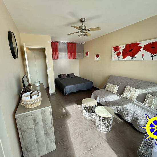 Dans résidence coté plage, au 2eme étage avec petite vue mer, spacieux studio cabine entièrement rénové, entrée avec placard, salle d'eau avec douche à l'italienne, coin nuit avec lit de 2 places, salon, loggia et superbe cuisine équipée, libre de suite, parking collectif, loyer 440 € + 10 € de charges (ordures ménageres Honoraires de 225 € TTC à la charge du locataire comprenant 75 € TTC pour l'état des lieux. Loyer de base 440 €/mois. Provision sur charges 10 €/mois, régularisation annuelle. Dépôt de garantie 440 €. Classe énergie C, Class...