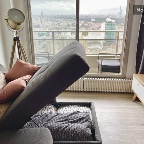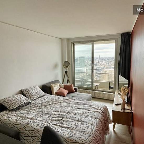 Exceptional, very bright and comfortable studio apartment, fully furnished and equipped, 25 m², internet, refurbished in 2022 and ideal for someone looking for a pied-à-terre in Paris/La Défense to live/work. In a recent and secure building with 24/24 guard and video surveillance, on the 35th floor (elevators), very bright and quiet, with an exceptional panoramic view on all Paris without vis-à-vis and completed by a balcony of 3 m² exposed South-West. At 7 min walk from the shopping center Les 4 Temps and its transports (RER A, Metro 1, Tra...