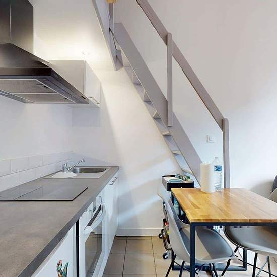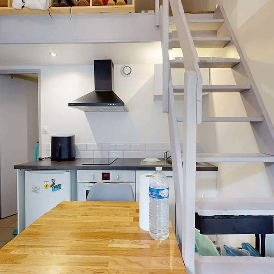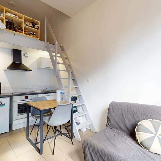 Spacest vous présente ce studio indépendant situé au 48B Boulevard Montesquieu à Roubaix, au rez-de-chaussée d’une maison. LE LOGEMENT Le studio se compose d’un espace de vie lumineux avec un coin salon aménagé d’un canapé et d’une table basse, ainsi qu’un coin repas. La cuisine ouverte est équipée de plaques de cuisson, d’un four, d’une hotte et d’un réfrigérateur, avec des rangements pratiques. Un escalier mène à une mezzanine accueillant l’espace nuit avec un lit double et des rangements. La salle d’eau moderne dispose d’une douche, d’un ...