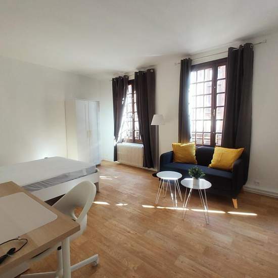 ROUEN RIVE DROITE - QUARTIER VIEUX MARCHE - Un studio meublé avec goût de 32,45 m2 au coeur de Rouen, comprenant une pièce de vie avec lit double, bureau, penderie, canapé, un coin cuisine équipée d'une table avec chaises, le nécessaire pour se restaurer, un frigo et un micro-ondes, une salle de douche et un WC. Vous serez charmés par cette rue piétonne à proximité immédiate de la place du Vieux Marché et non loin des transports en communs (métro, TEOR etc. ...). Chauffage, eau chaude et eau froide compris dans les charges DISPONIBLE DE SUIT...