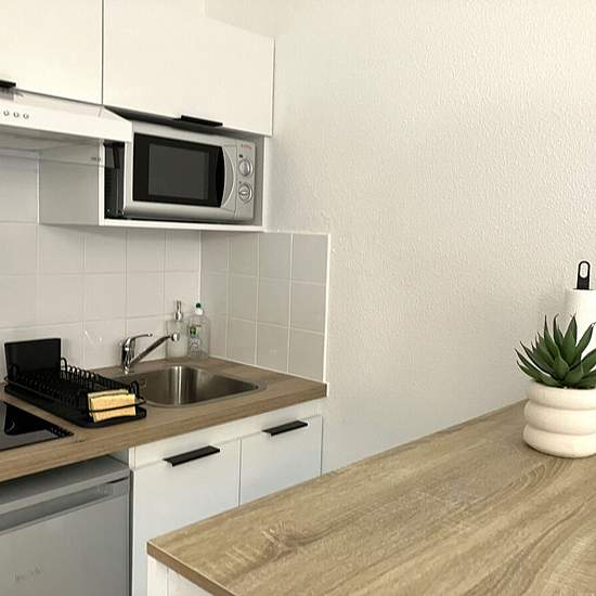 Ce studio MEUBLE, exposé Est, est situé au rez de chaussé d'une résidence de bord de mer connue à Saint Hilaire de Riez . Il comprend une pièce à vivre avec un canapé convertible et une télévision, un coin cuisine aménagé et équipé (plaques de cuisson, micro ondes multifonctions, mini réfrigérateur, hotte, table de cuisine avec chaises,...), une salle de bains avec wc et sèches serviettes, une véranda (canapé) et une terrasse en bois. Les travaux ont été réalisés en 2025. Bien en copropriété. Dépôt de garantie : 840 Euro. Honoraires locatair...