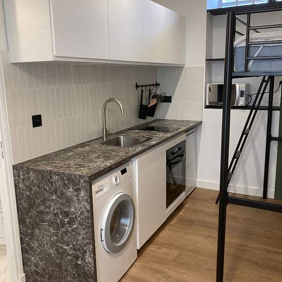 RENNES - rue de Nantes, studio entièrement MEUBLÉ et composé : un espace de vie avec canapé et tables basses, un espace nuit avec lit mezzanine et bureau en dessous, une cuisine aménagée et équipée, une salle d'eau avec WC. Terrasse privée et local vélo commun. Libre de suite. Loyer : 620,00 euros + charges : 30,00 euros (eau, électricité) - Dépôt de garantie : 1 240,00 euros - Honoraires : 190,06 euros. Référence : 772 - Tél :