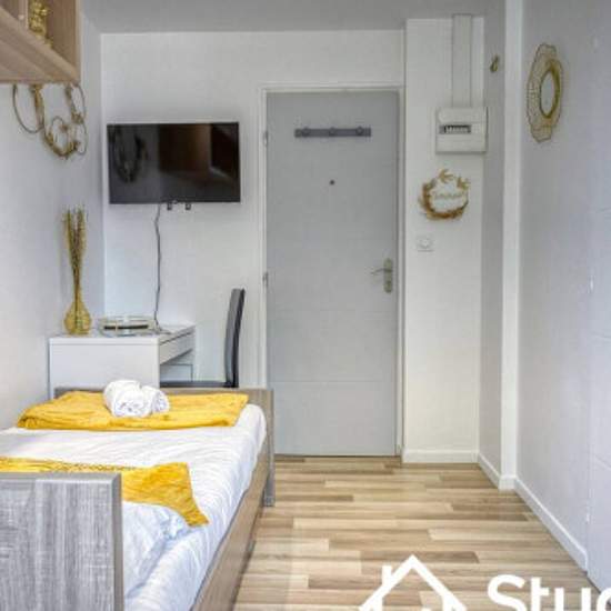 Le logement est situé au rez-de-chaussée et possède une entrée privative. Il possède à l'entrée du logement un coin bureau. Juste à côté se trouve un lit une place avec de nombreux rangement sous le lit. Ces pièces sont séparé de grands rideaux pour avoir un coin nuit agréable. De l'autre côté se trouve le coin cuisine, équipé de tous les équipements nécessaires pour passer un court comme un long sejour qui est accompagné de sa table à manger avec 2 tabourets. Au fond du logement se trouve un grand placard pour y déposer vos affaires Updated...