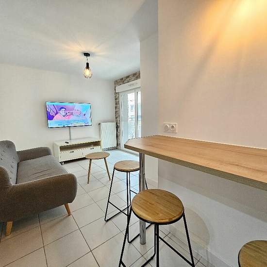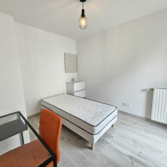 Colocation dans une résidence année 2015 avec ascenseur, colocation de 4 chambres entièrement meublée / équipée (lit 1 place, 1 meuble étagères / penderie, 1 table bureau, table de chevet. ) dans appartement de 73.56 m² hab. Sis au 1er étage / 3. Hall avec placard aménagé - cuisine meublée / équipée (plaque de cuisson à induction 3 feux, hotte, four, micro-onde, réfrigérateur / congélateur, table haut avec 4 tabourets) - salon avec canapé 3 places en tissu gris, 1 table ronde, 1 meuble tv avec 2 tiroirs, 1tv) / baie vitrée donnant sur terras...