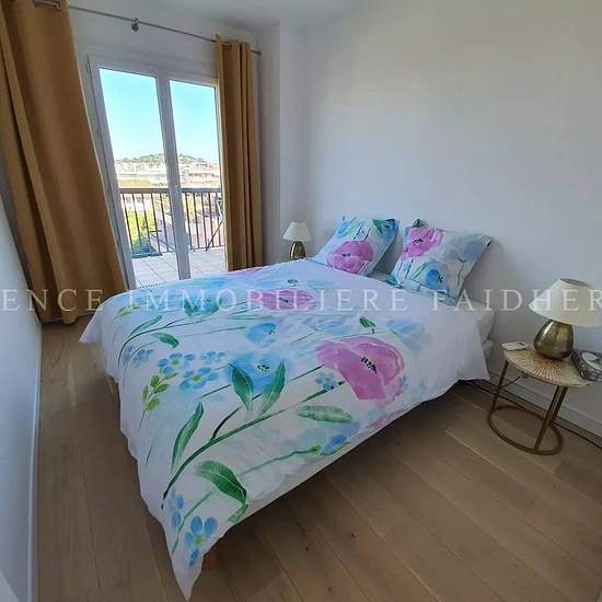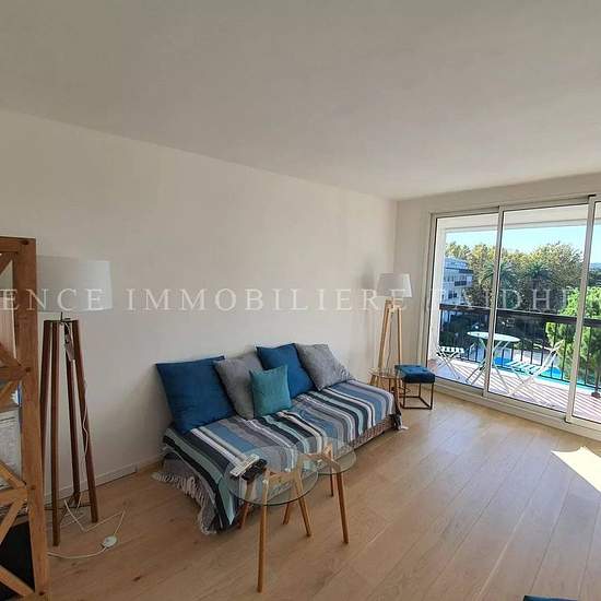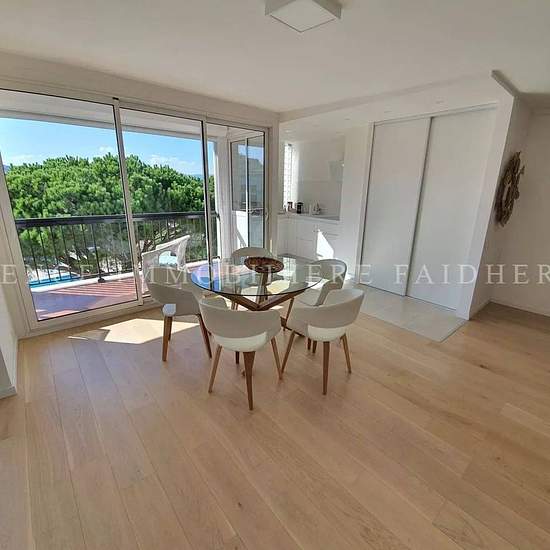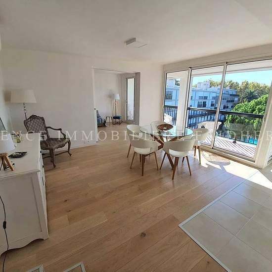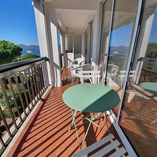 630AK Très bel appartement traversant rénové dans résidence privée avec piscine composé d'un salon, salle à manger, cuisine ouverte toute équipée, une chambre avec un lit en 160 et une chambre avec 2 lits simples en 90, une salle de douches et toilette séparé. Une terrasse côté chambre vue sur mer et village de saint Tropez et balcon côté salon, salle à manger vue mer et piscine. Charges : ménage final 180€, linge 80€ Taxe de séjour : 6,91€/jour/adulte