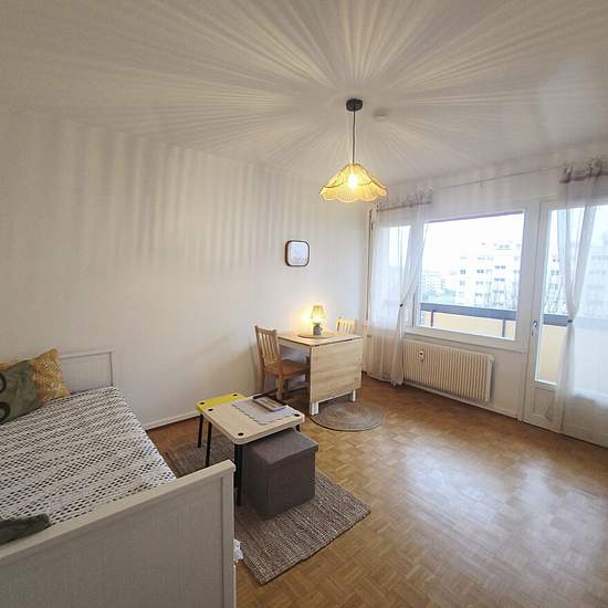 Studio meublé de 23,16m2, situé à Neudorf 22 rue d’Orbey au 6ème étage avec ascenseur, à deux pas de l’arrêt tram Jean-Jaures et de toutes commodités. Cet appartement entièrement refait à NEUF, comprend une entrée, une belle pièce de vie meublée avec goût ( lit, tables basses, table de séjour, placard…) donnant sur un balcon de 8m2, un coin cuisine meublé et équipé, une salle de bain moderne avec douche, sèche serviette, machine à laver et WC. Une cave et une place de parking complètent ce bien. Loyer: 650€, charges : 80€ ( chauffage, eau ch...