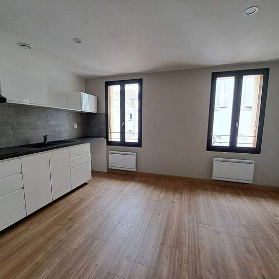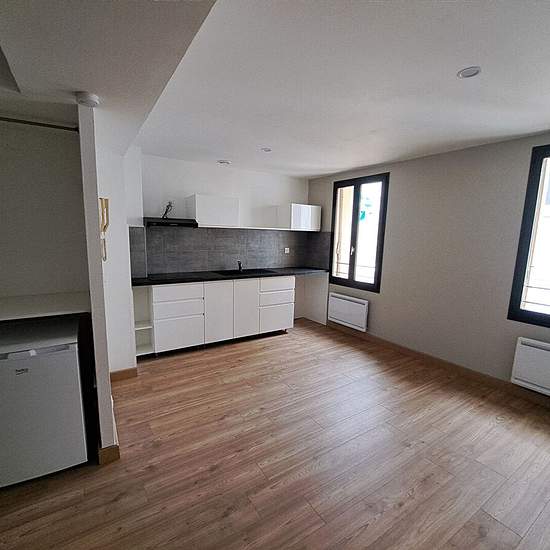 Beau studio entièrement refait à neuf à louer en centre ville de Villeneuve sur Lot comprenant une pièce de vie avec placard et cuisine ouverte meublée et équipée (hotte, plaque électrique et frigo top) et une salle de bain avec WC.
